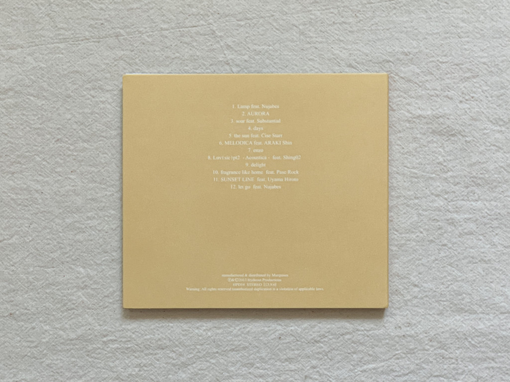 재킷도 이 작품만은 nujabes 씨의 작품을 다루는 디자이너 후지타(藤田) 씨에게 부탁하고, nujabes 씨의 레이블"hydeout"에서 발매했다.