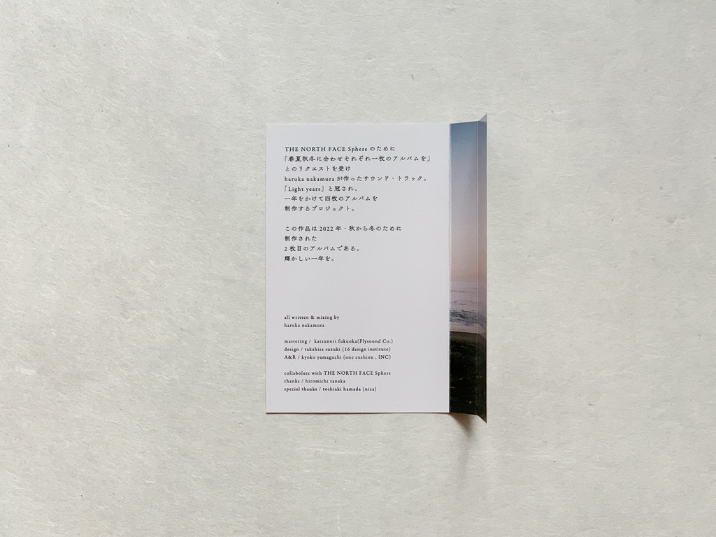 그 사운드트랙으로 '봄 여름 가을 겨울에 맞춘 각각 한 장의 앨범'을 요청받아, 하루카 나카무라가 만든 음악은 'Light years'라는 이름하에 1년에 걸쳐 네 장의 앨범을 만드는 프로젝트가 되었습니다.