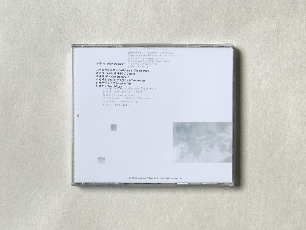 ‘슬픈 시’의 영어 제목은 ‘Our Poetry’다. 여기서 ‘우리(Our)’는 구체적으로 누구일까 궁금했다. 인터뷰에서 수진은 참 많은 이름, 얼굴을 떠올렸다. 말하자면, 여기서 우리는 ‘나’를 포함한 배타적 그룹으로서의 우리가 아니라, 이것이 나와 당신 그리고 우리 모두의 정서에 관한 음반임을 강조하는 표현이다. 힘겹게 삶과 맞부딪혔던 친구의 얼굴이기도 하고, 거리에서 본 낯선 이의 뒷모습이기도 하다. 슬픔은 개인화된 감정이 아니다. 운문(poetry)처럼 일상의 언어가 낯선 문학의 운율로 묶일 때 그것은 정신이 된다. 우리의 형식이고 우리의 감정이 된다.